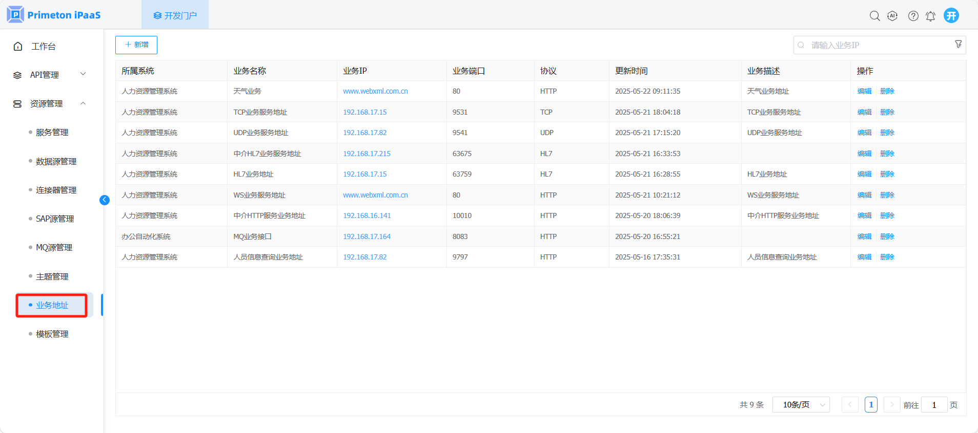 开发人员登录系统,进入开发门户, 点击菜单“资源管理“ >”业务地址” ,右侧区域显示 “业务地址” 界面。
