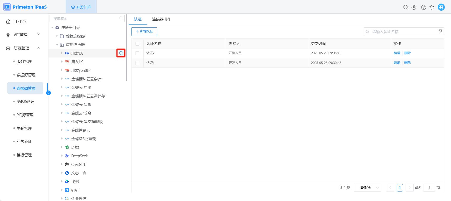 开发人员登录系统,进入开发门户,点击菜单“资源管理“ >“连接器管理” ,右侧区域显示 “连接器管理”界面。