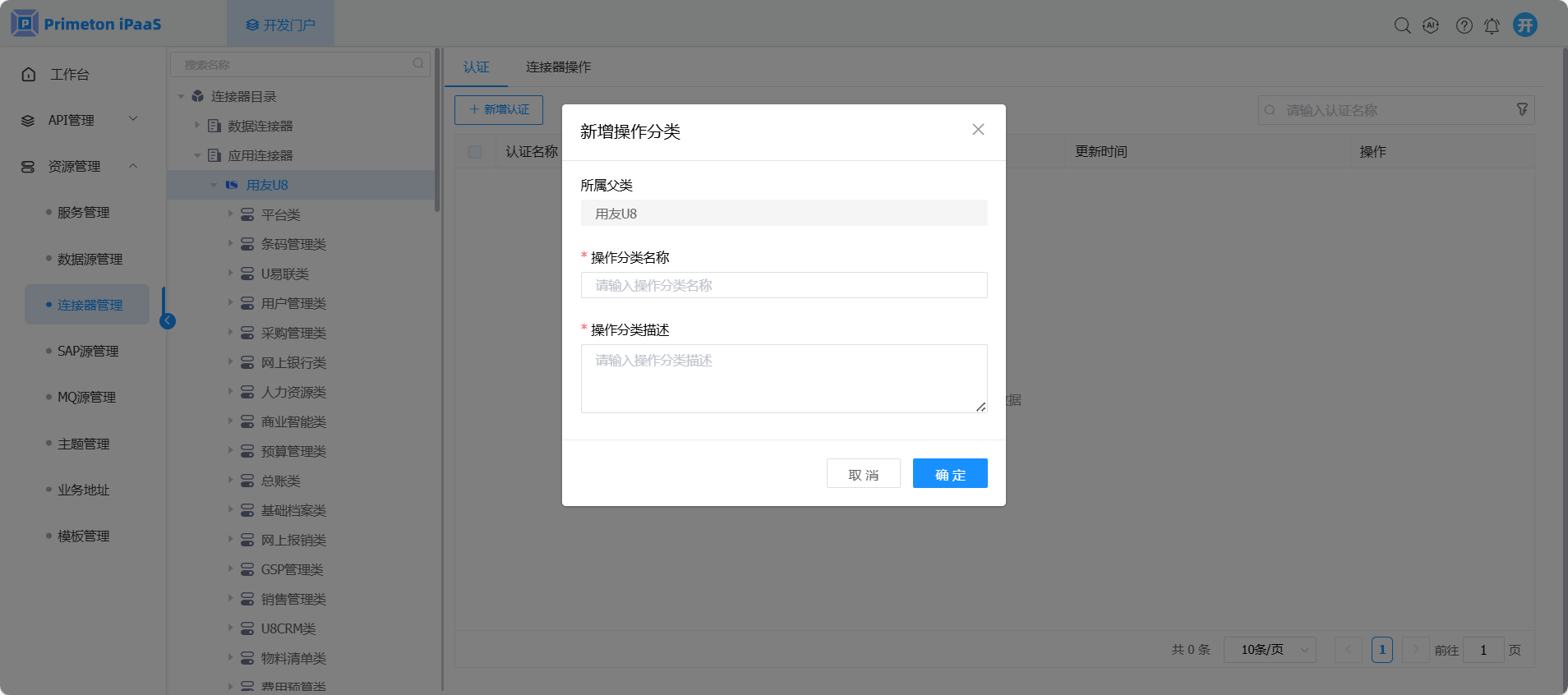 鼠标悬浮于左侧树的需要新增操作分类的连接器或父操作分类节点上,点击“+”号新增按钮,弹出该连接器的操作分类新增页面。