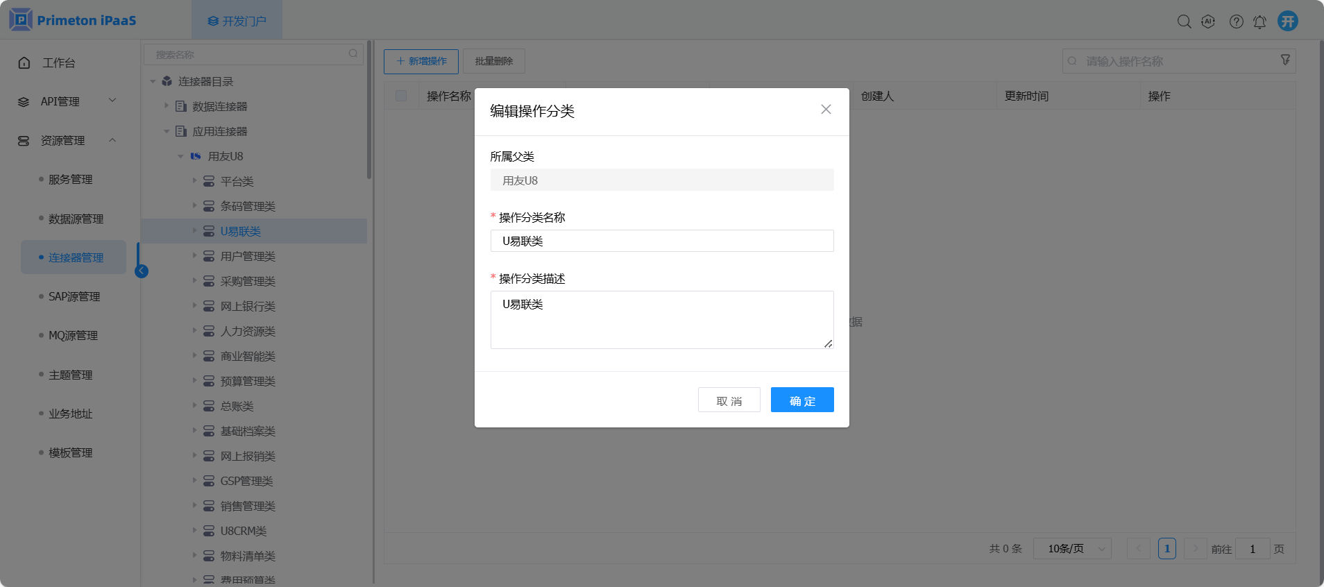 鼠标悬浮于左侧树的需要修改操作分类节点上,点击修改按钮,弹出该连接器的操作分类修改页面。