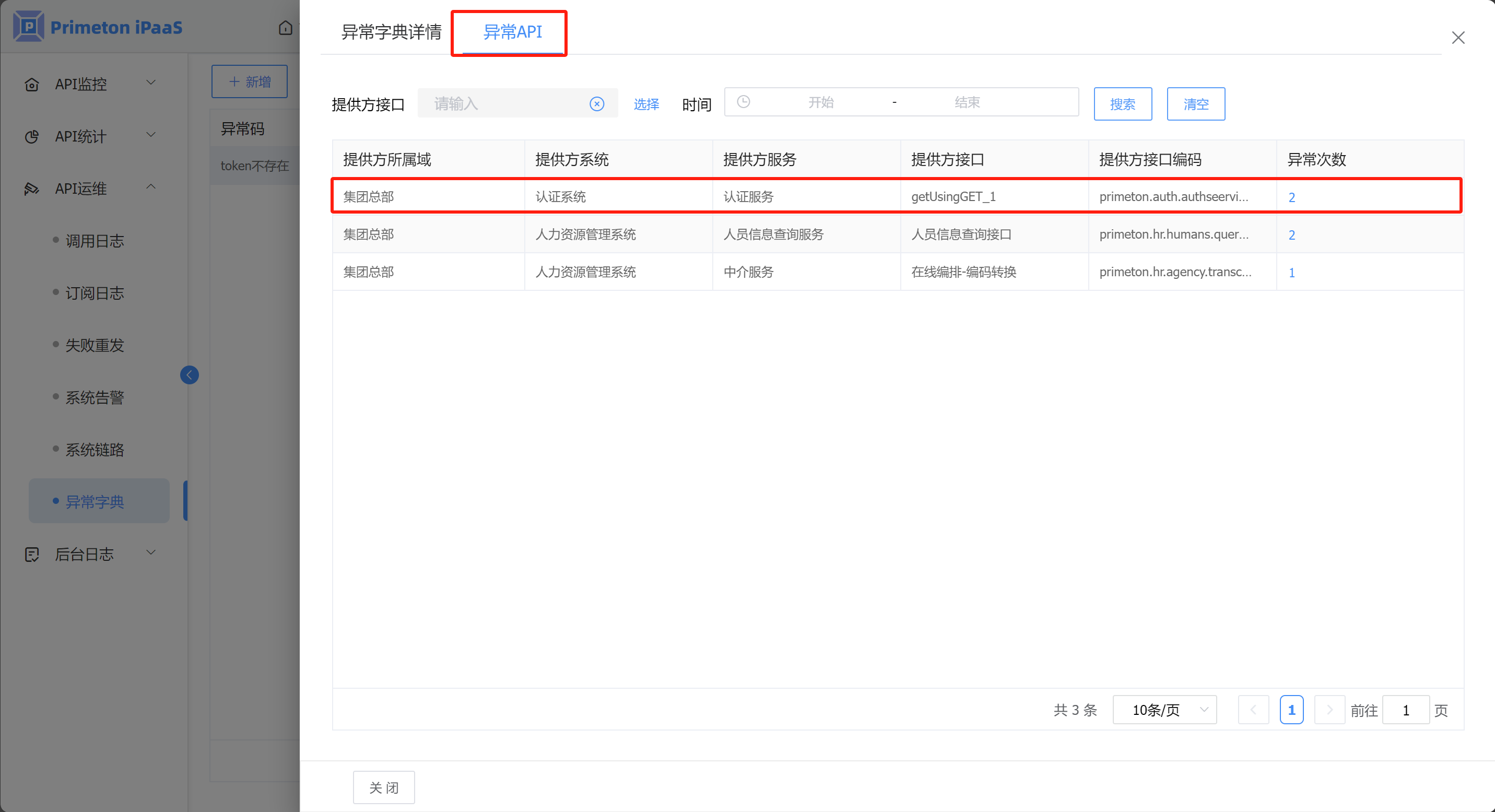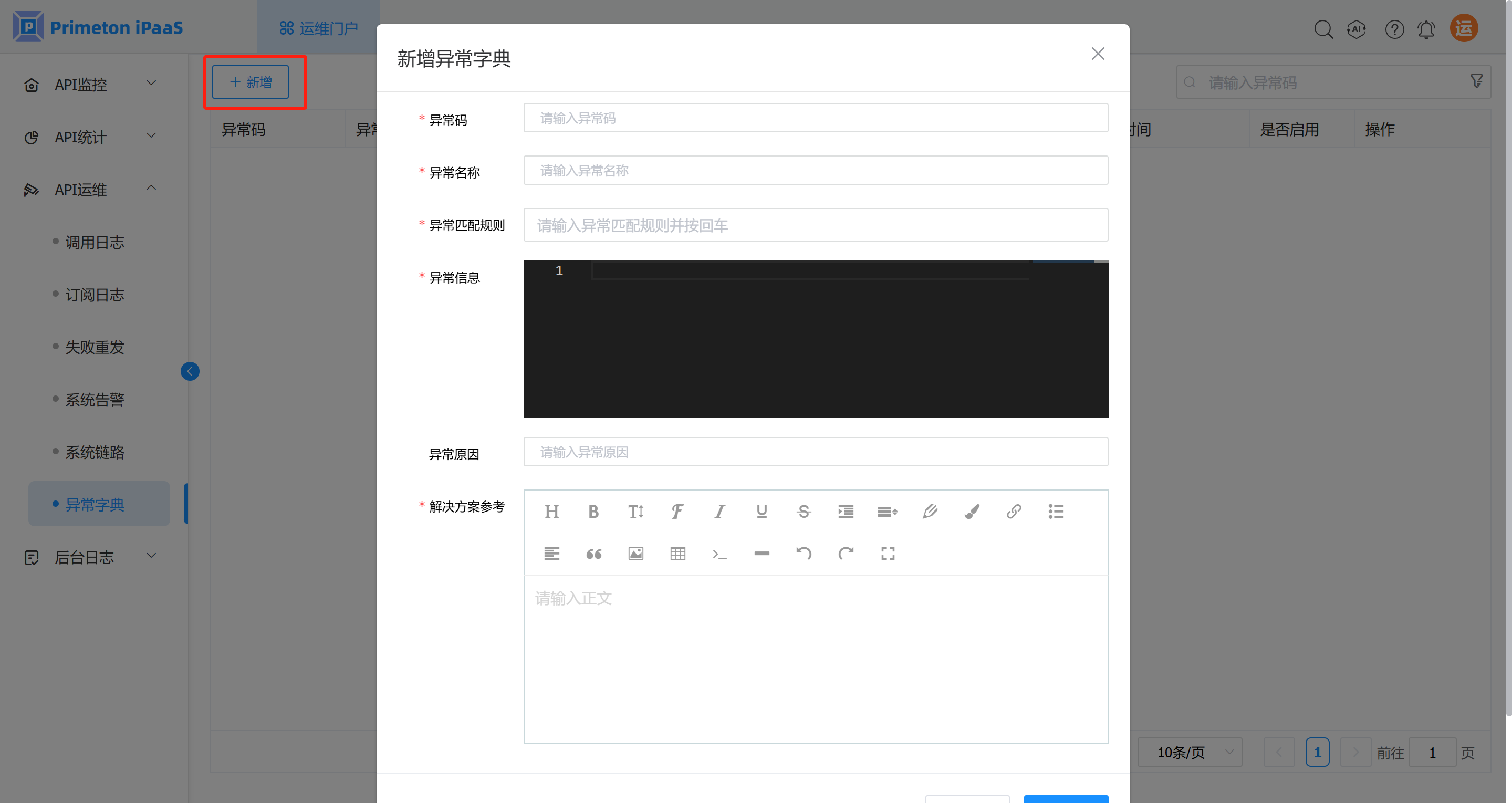 1. 登录运维人员账户(monitor/000000),进入运维门户,点击菜单“API运维”>“异常字典”,进入“异常字典”页面。