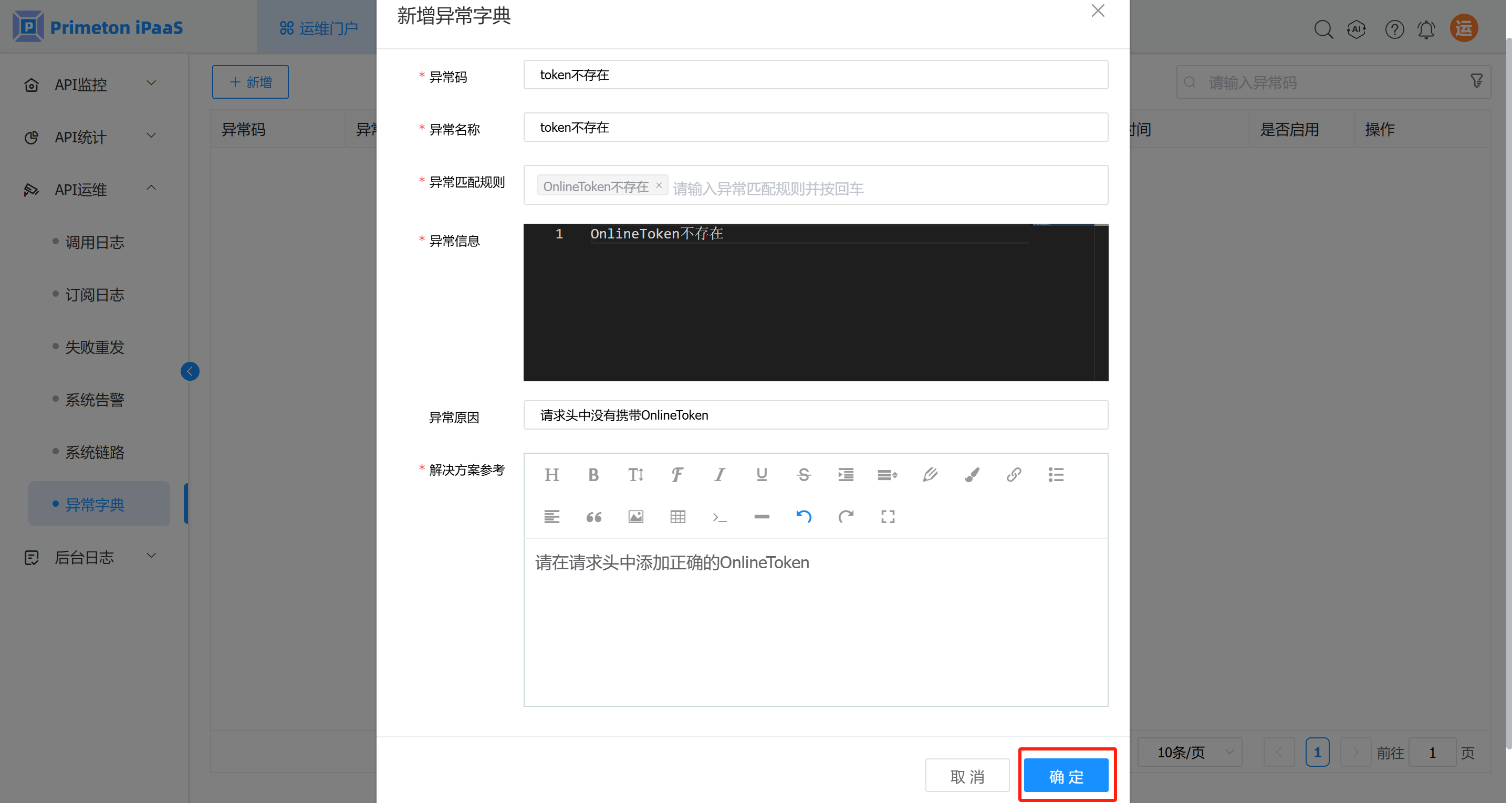 1. 填写相关信息后,点击”确定”按钮,保存异常字典信息。