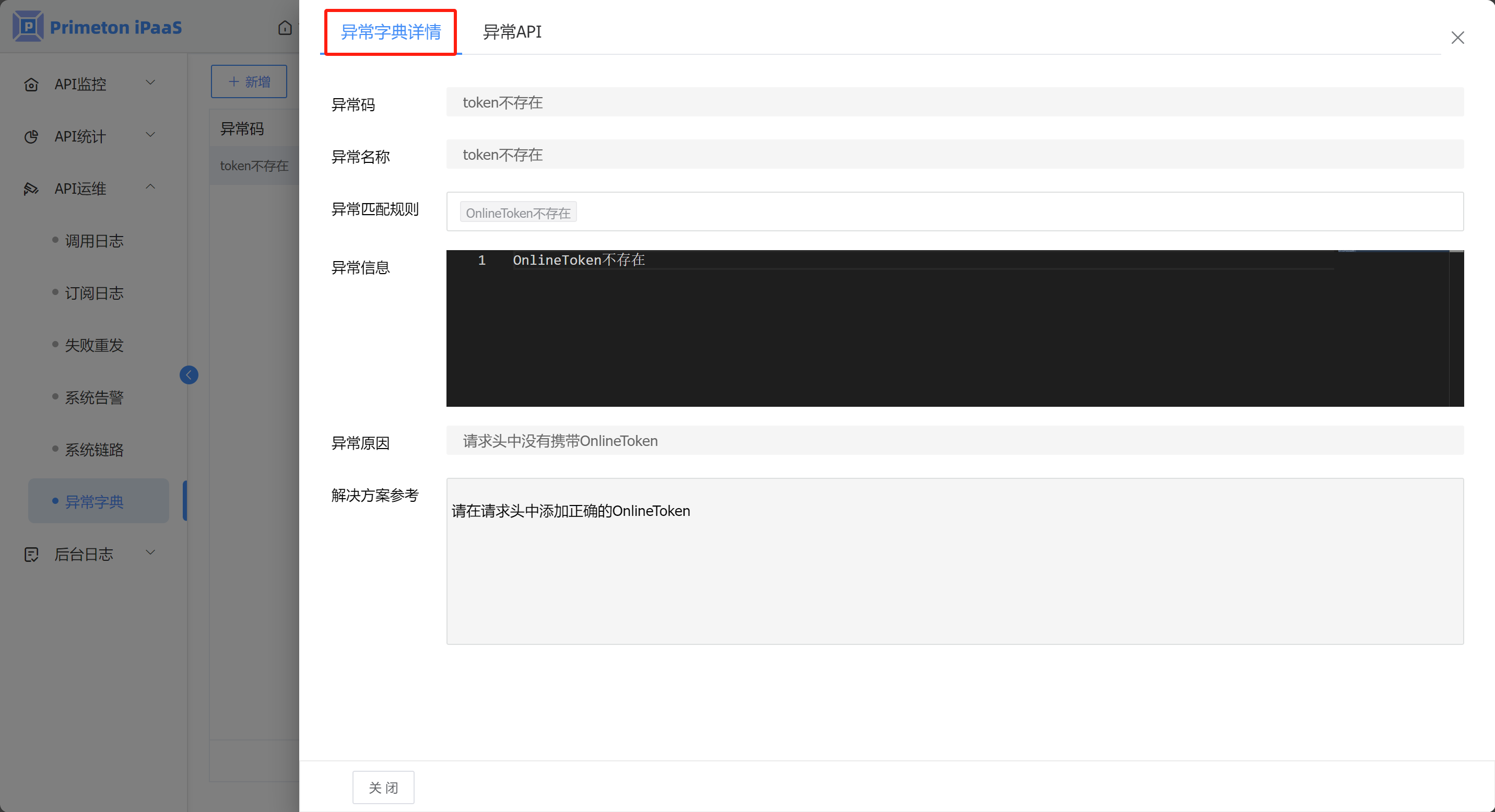 3. 点击“异常名称” ,可查看异常字典详情和触发异常字典的异常API。