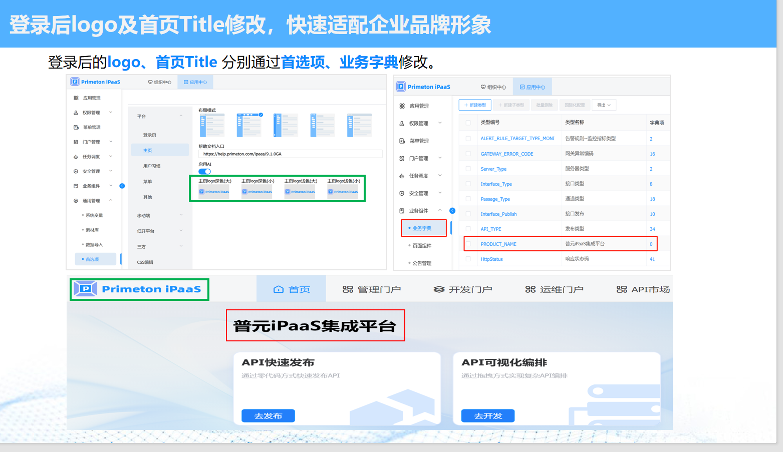 登录后的logo、首页Title 分别通过首选项、业务字典修改。