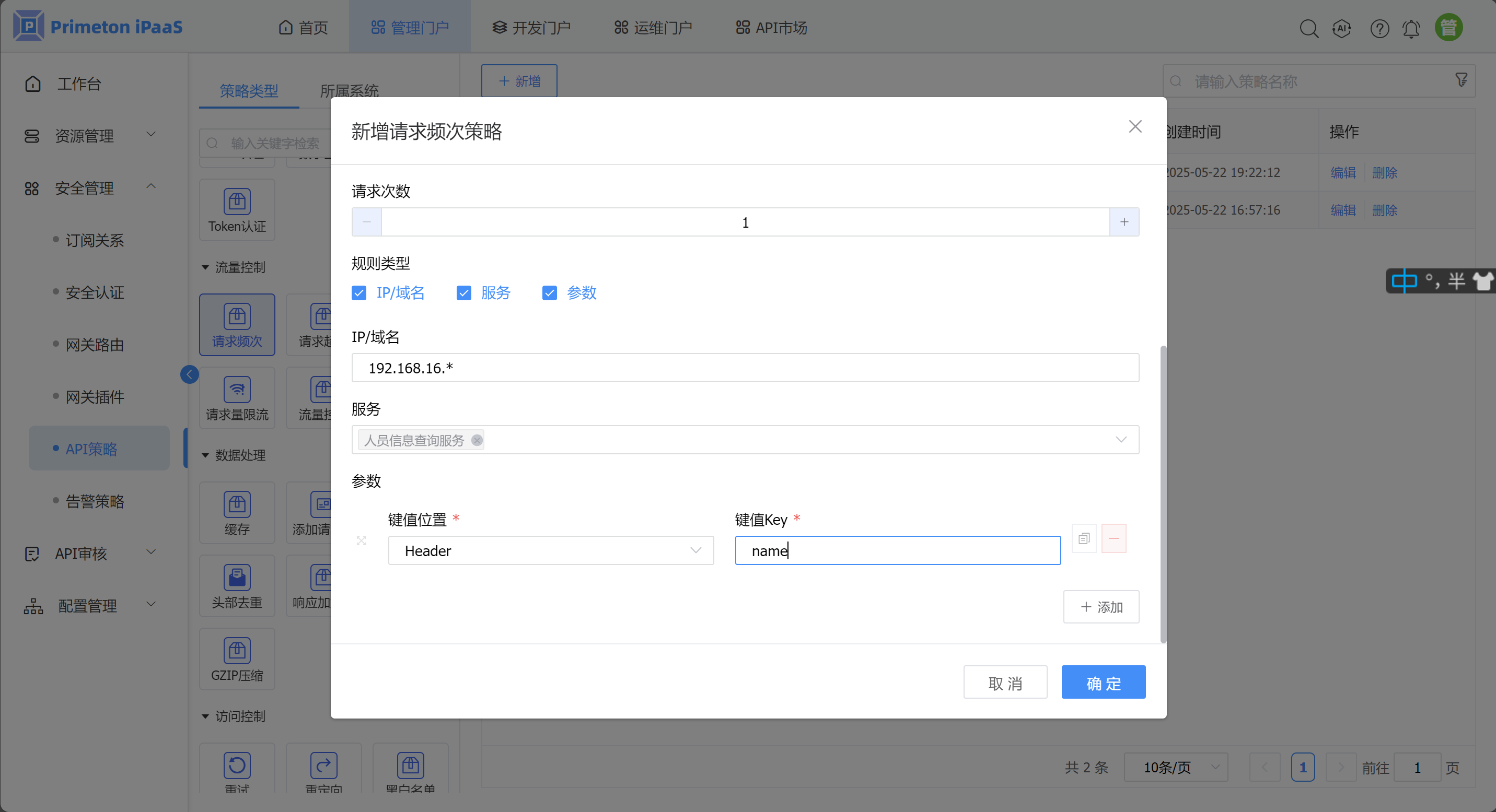参数 说明 策略名称 策略的名称 时间间隔 固定窗口的时间大小 请求次数 规定时间内可以访问的次数 规则类型 请求执行规则的条件,若多选类型则都需要匹配 IP/域名规则对象 对ip来源进行配置,支持“,”分隔,支持“*”模糊匹配 服务规则对象 从注册的服务中选择API服务 参数规则对象 对header、query、body参数中是否存在key-value进行匹配