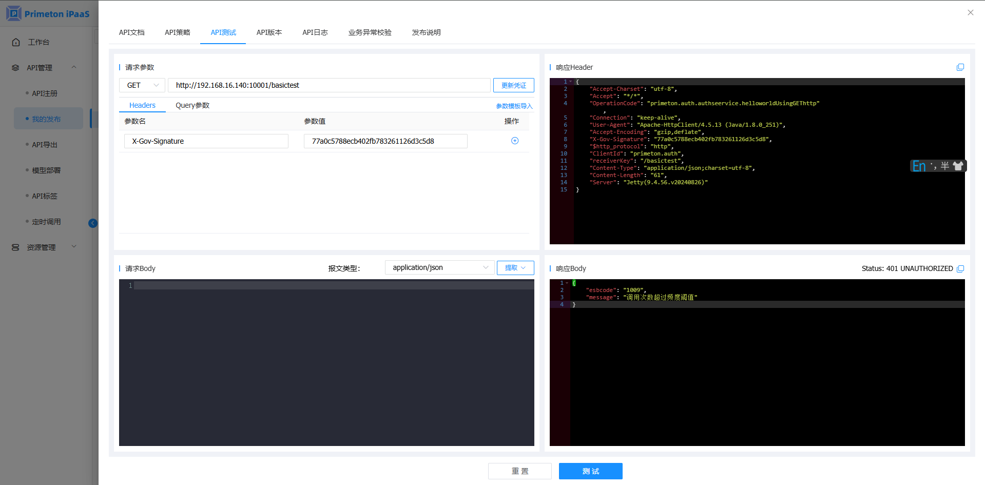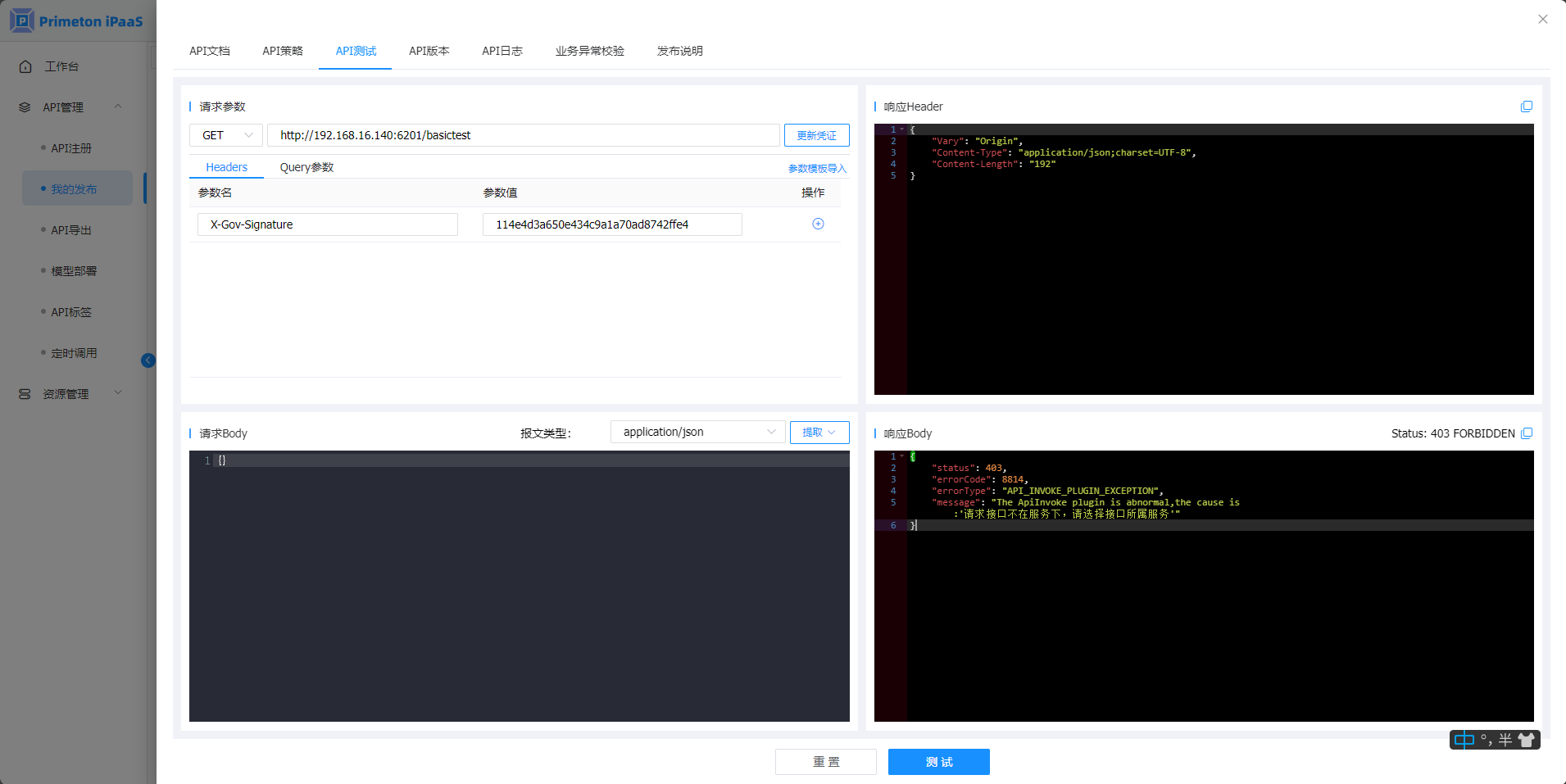 添加策略到API接口,在"API测试"中,查看调用结果: