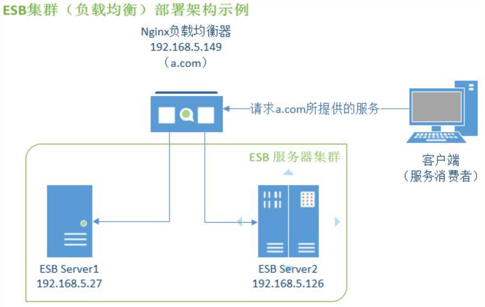 物理部署方案中,4 台 ESB 服务器通过 F5 做硬件负载均衡,除了 F5 硬件负载外,可以使用 Apache 和 Nginx 实现软负载,相关配置方法均可在搜索引擎中 查询到详细配置过程,这里不做详细说明。