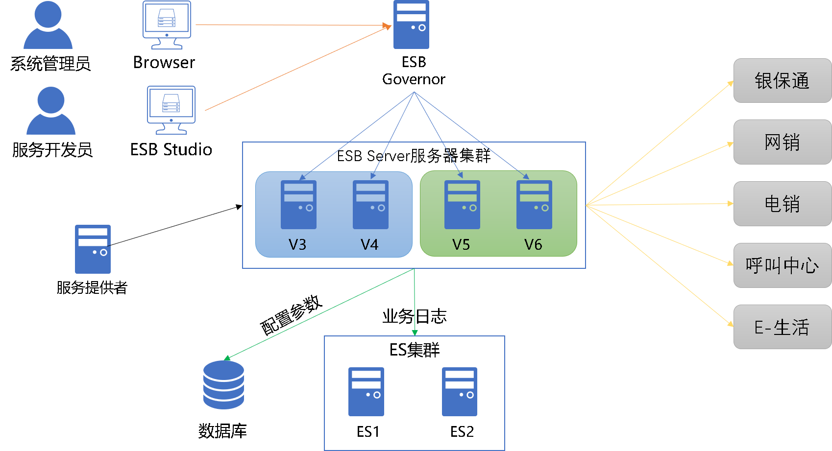 服务开发人员根据业务需求开发业务接口模型,通过ESB studio导出部署包,系统管理员通过浏览器访问 iPaaS Portal 将部署包部署到 ESB server 的集群, 即图中的 ESB Server1 和 ESB Server2 上。 服务消费者如银保通、网销、电销等外围系统访问 ESB server 对外暴露的服务,外围消费者不用关心服务提供者 的真实服务,从而屏蔽系统间差异;请求从 消费者经 ESB 到达服务提供者系统,真实业务接口处理完业务后再将处理结果 经 ESB 返回给消费者系统,整个过程 ESB 都会产生拦截日志,保存在ES中。