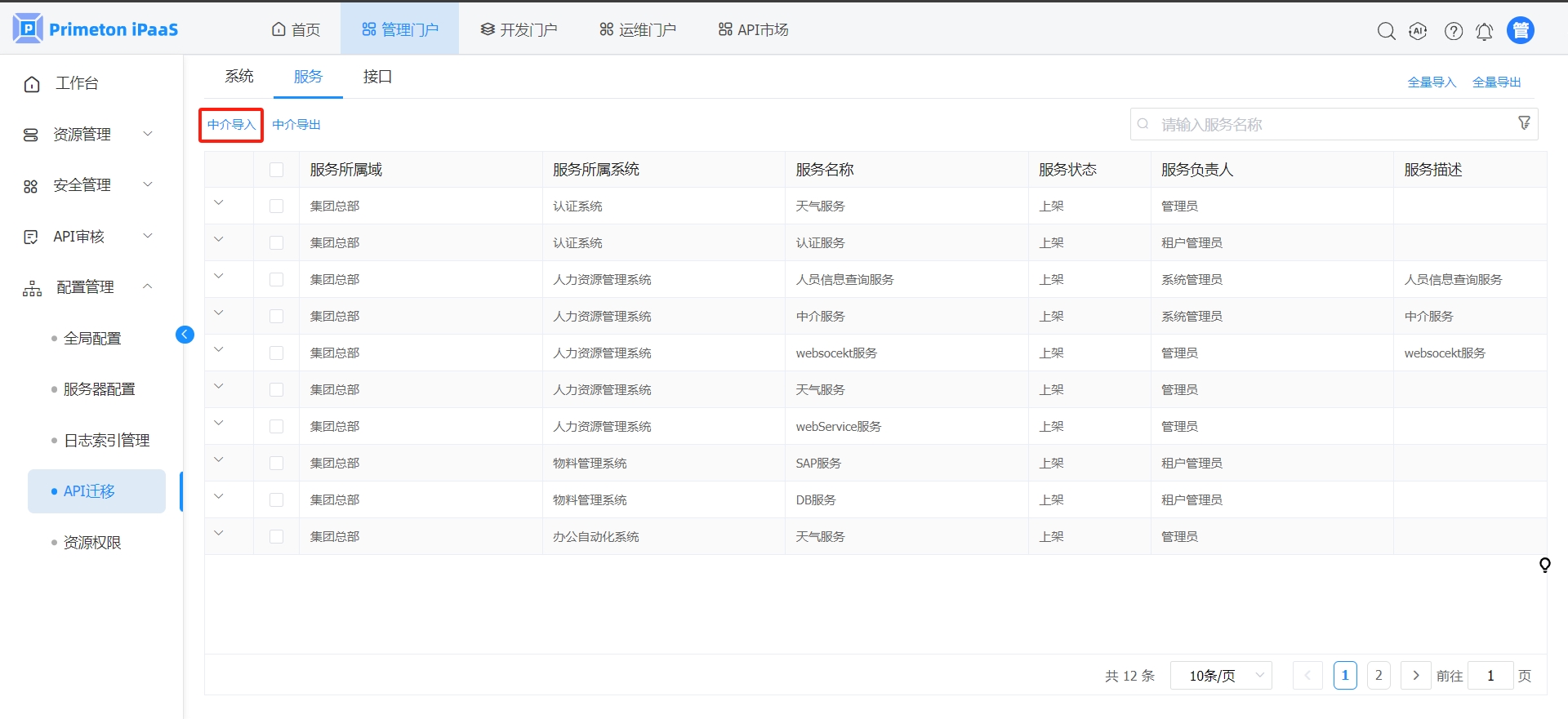 使用管理员账号登录生产环境,点击“管理门户->配置管理->API迁移”,进入API迁移页面,点击服务页签,点击“中介导入”按钮,弹出中介导入页面。