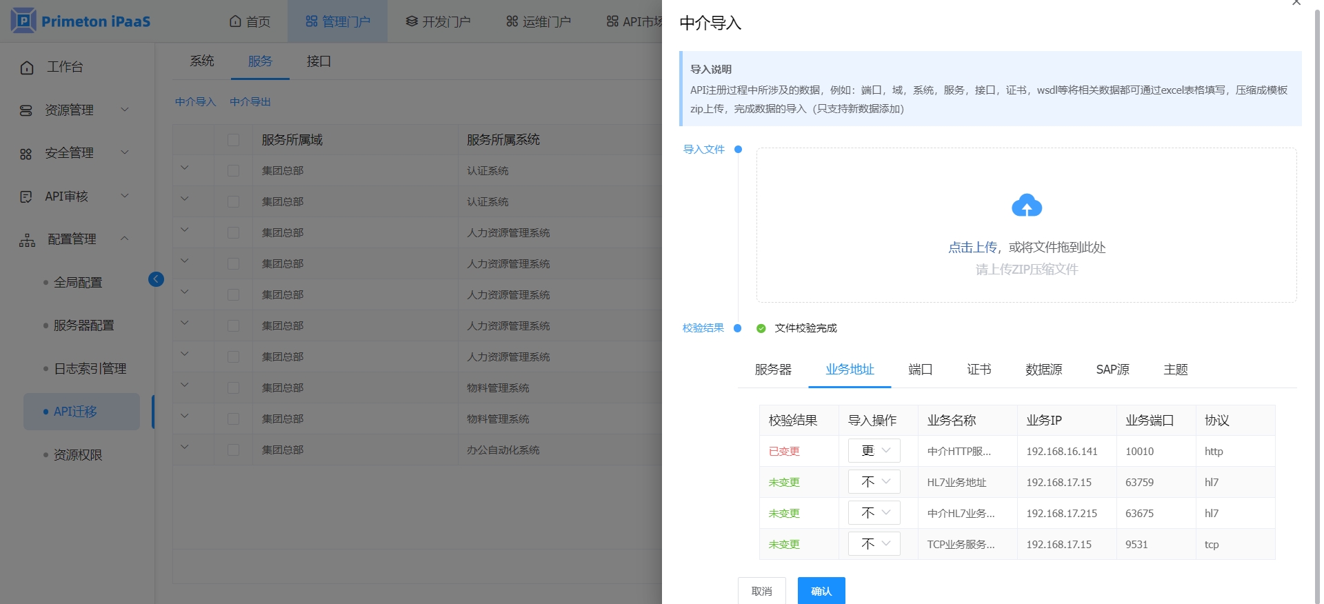 如果中介导入的业务服务地址在生产环境已存在(必须是ID相同),但是二者的配置不相同,校验结果是“已变更”。