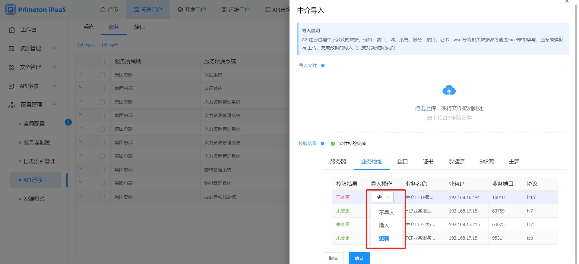 - 校验结果为“已变更”的业务地址,导入时默认更新生产环数据库中的数据,用户可以修改导入操作不更新生产环境数据库中的数据。 修改业务服务地址的导入操作如下图: