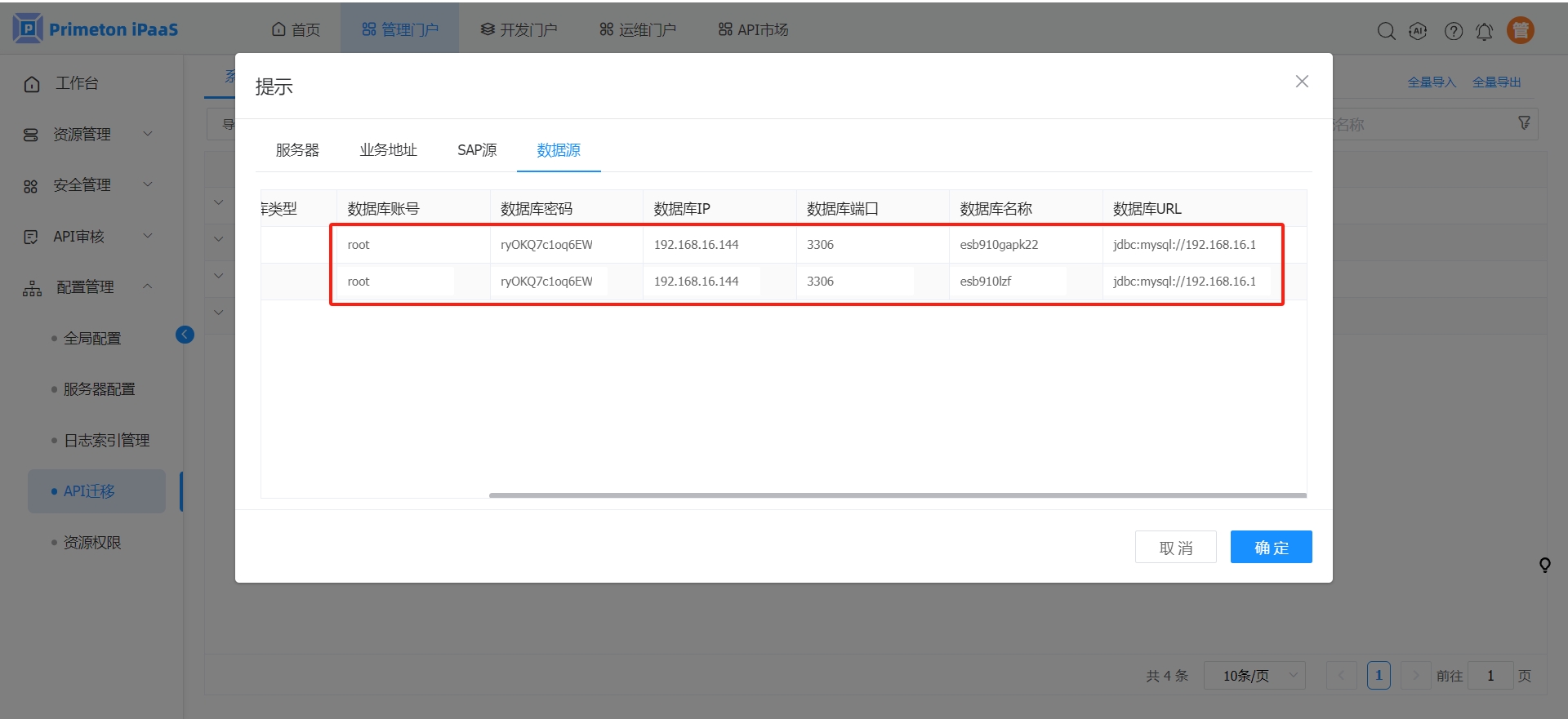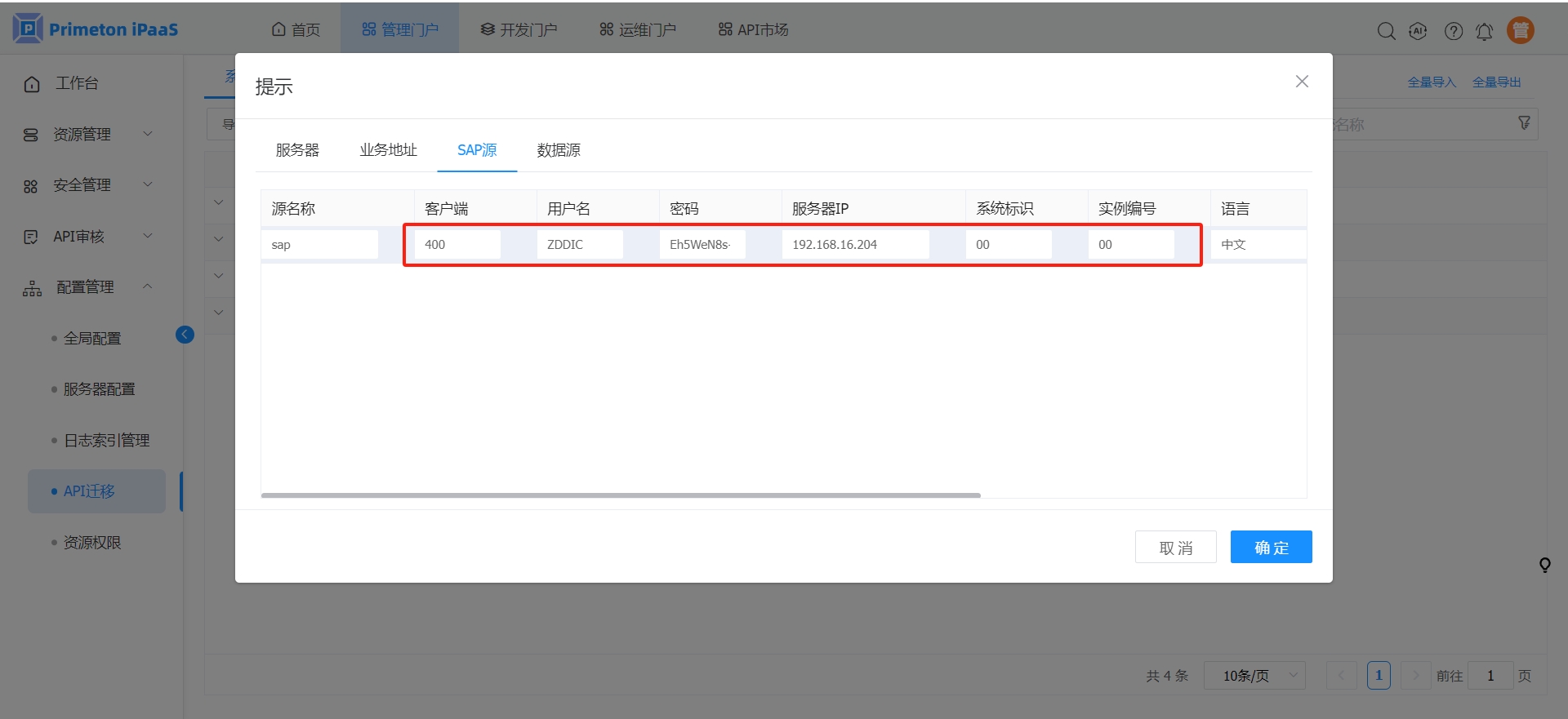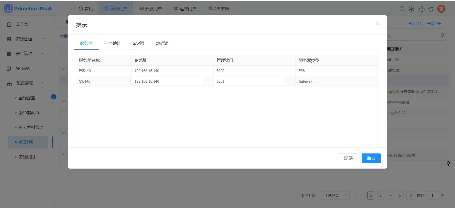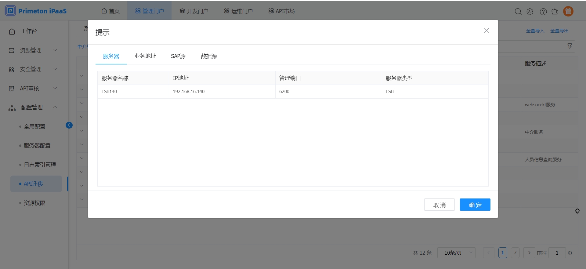 使用manager账号登录测试环境,点击“管理门户->配置管理->API迁移”,进入API迁移页面,在右上角点击“全量导出”按钮,弹出修改资源环境配置页面。