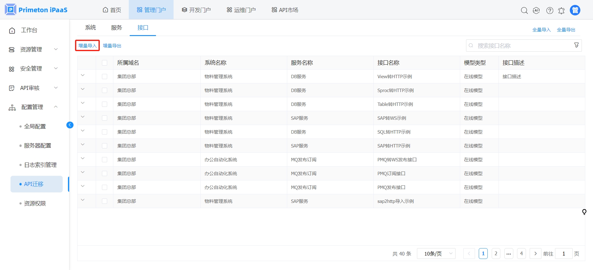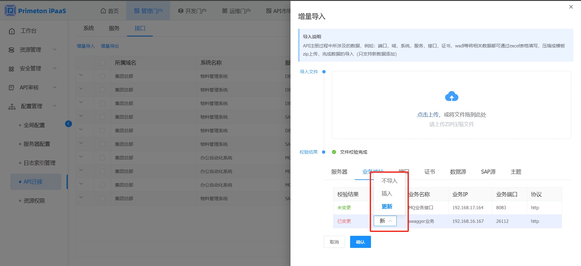 使用管理员账号登录生产环境,点击“管理门户->配置管理->API迁移”,进入API迁移页面,点击接口页签,点击“增量导入”按钮,弹出增量导入页面。