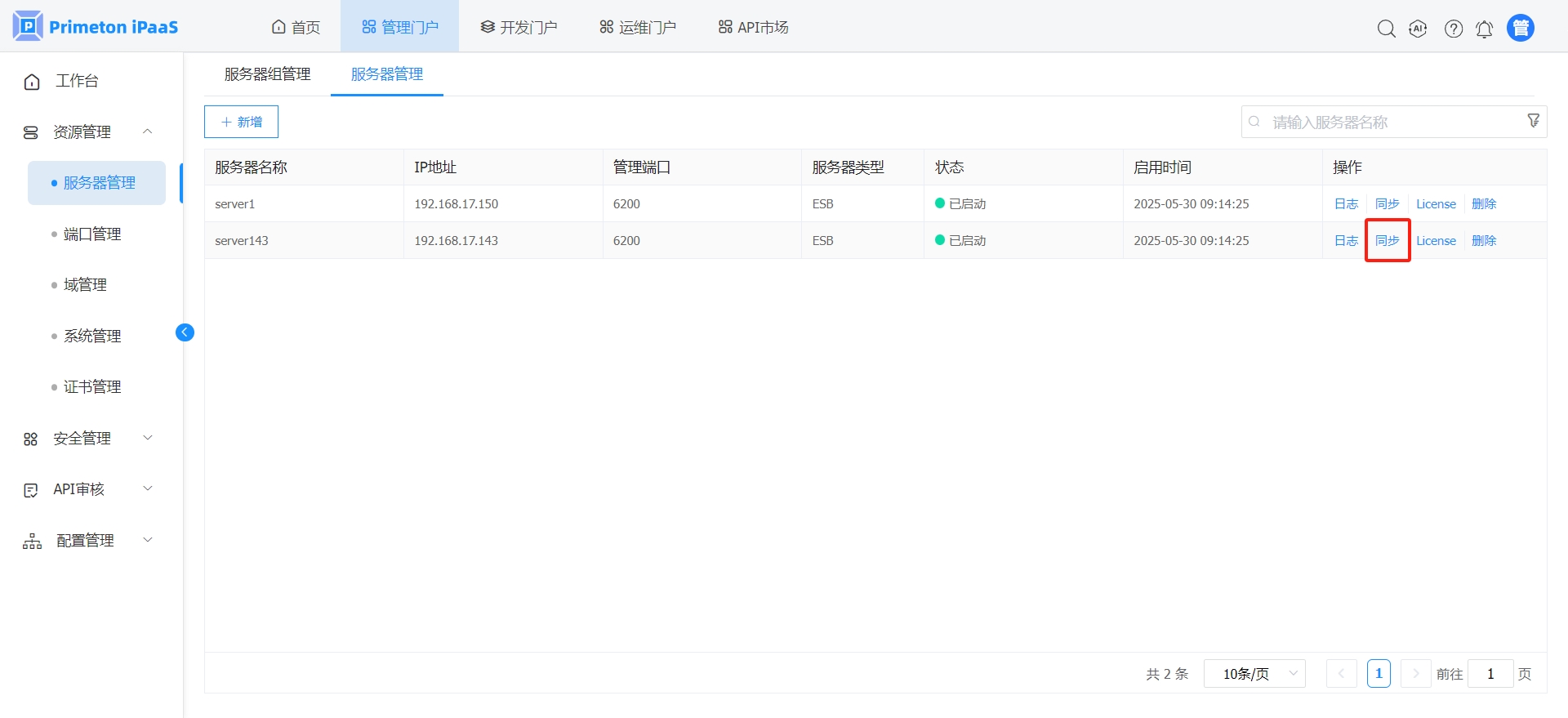 在生产环境导入成功后,在服务器管理页面,只保留生产环境的ESB-Server服务器,删除其他ESB-Server服务器。然后在生产环境的ESB-Server服务器操作列,点击“同步”按钮,同步服务器。