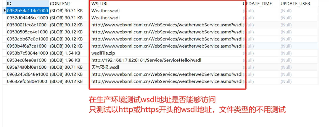 使用数据库连接工具,打开测试环境的sam_wsdl表,查询WS_URL字段,测试wsdl地址是否能够访问(在生产环境测试)
