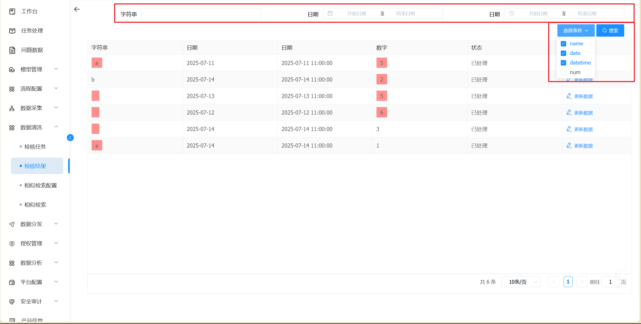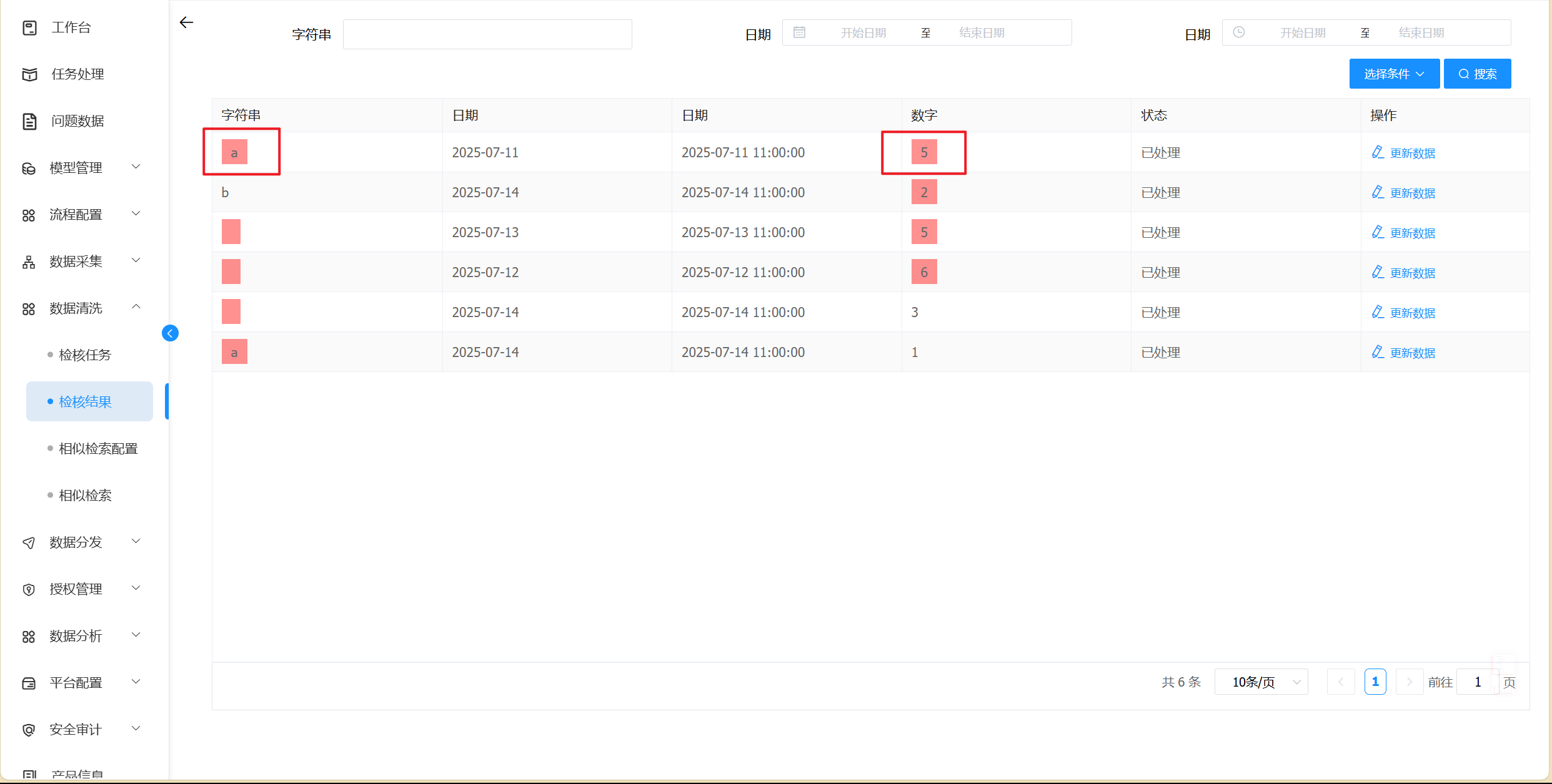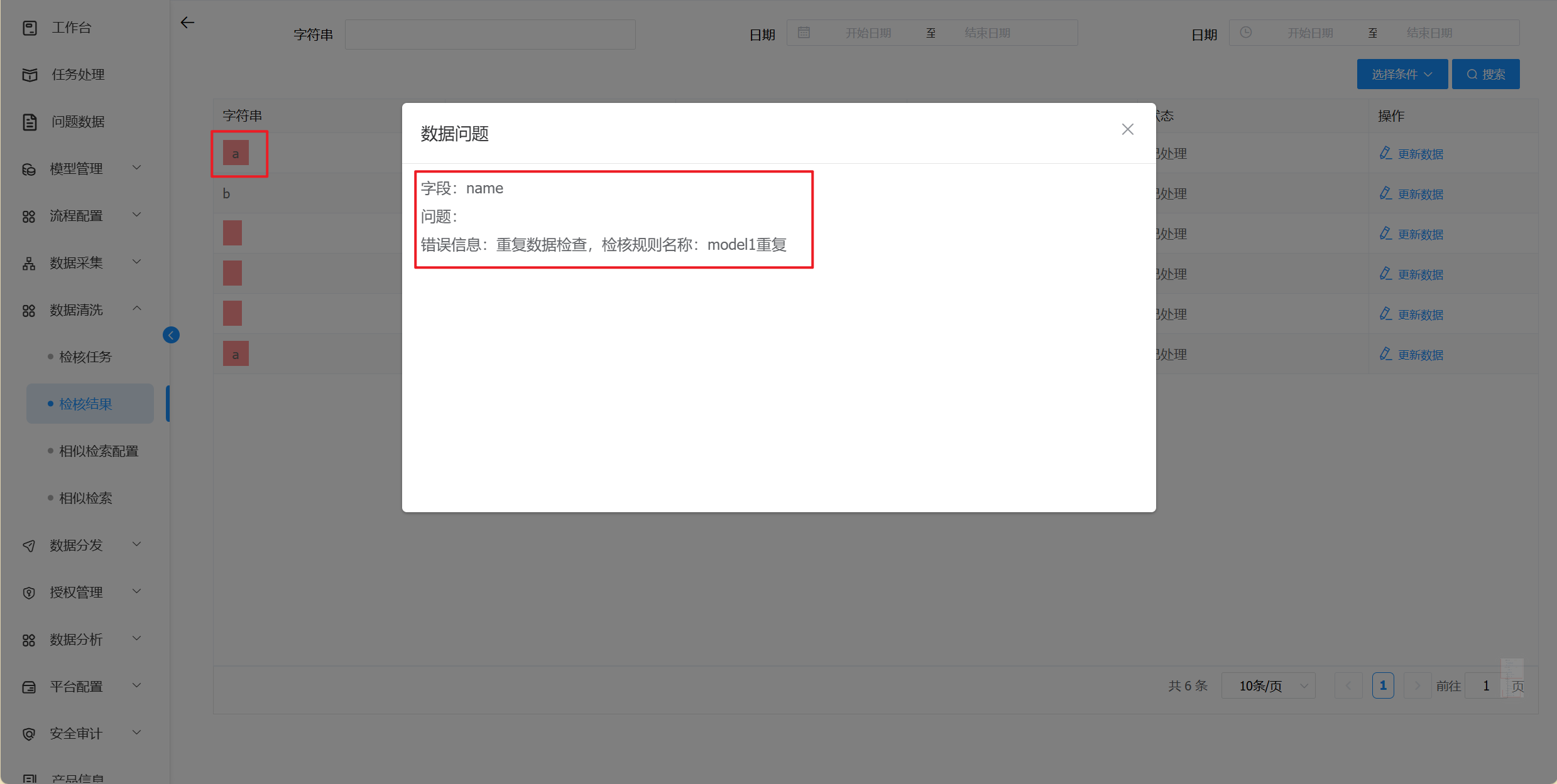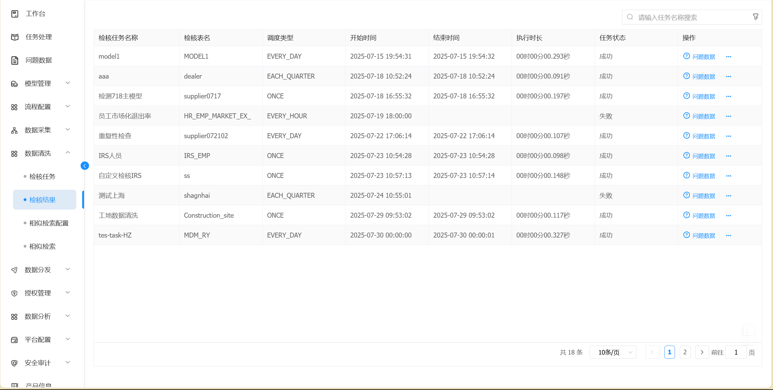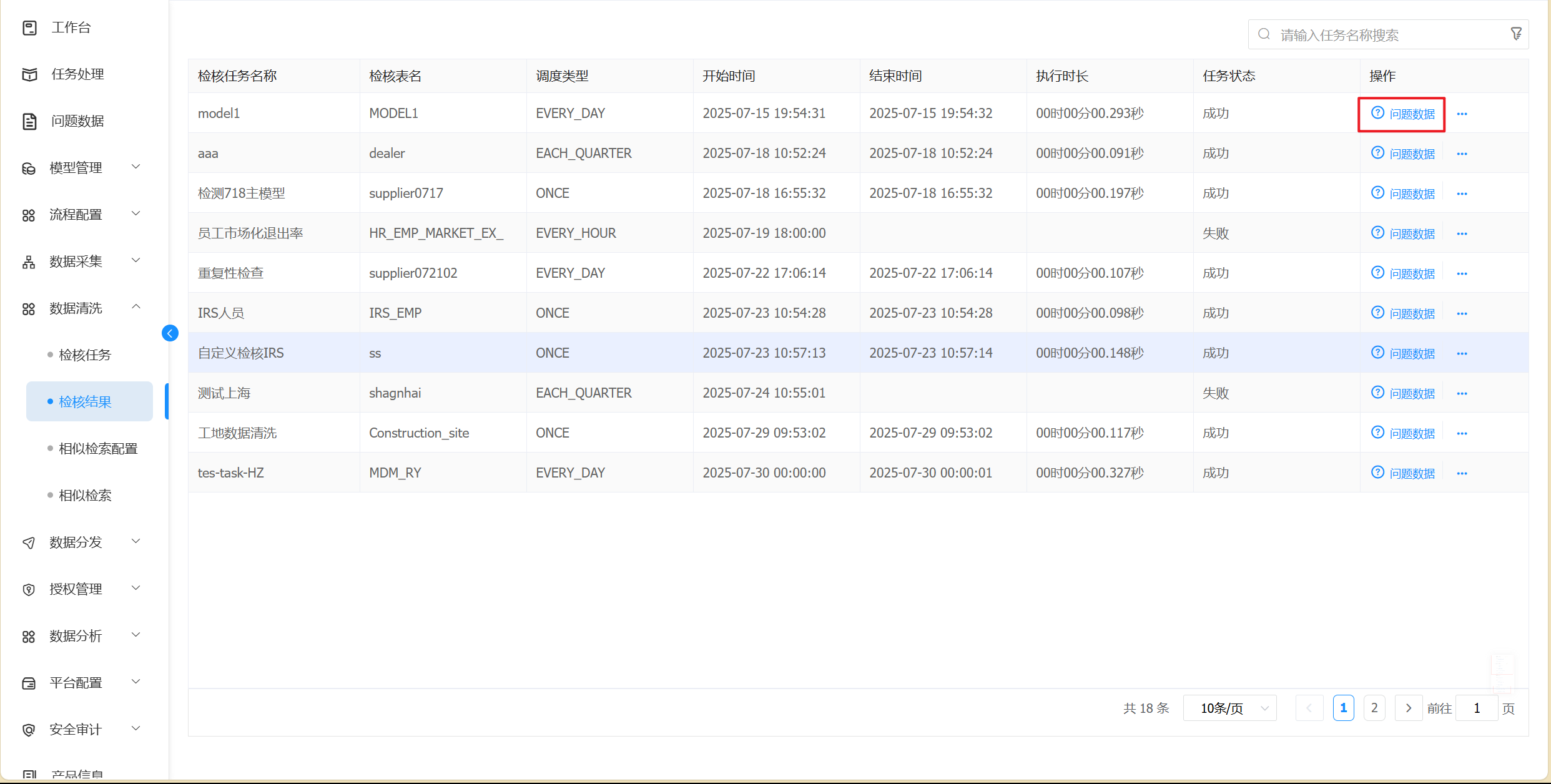 访问路径【主数据管理门户】→ 【数据清洗】→【检核结果】进入检核结果页面。