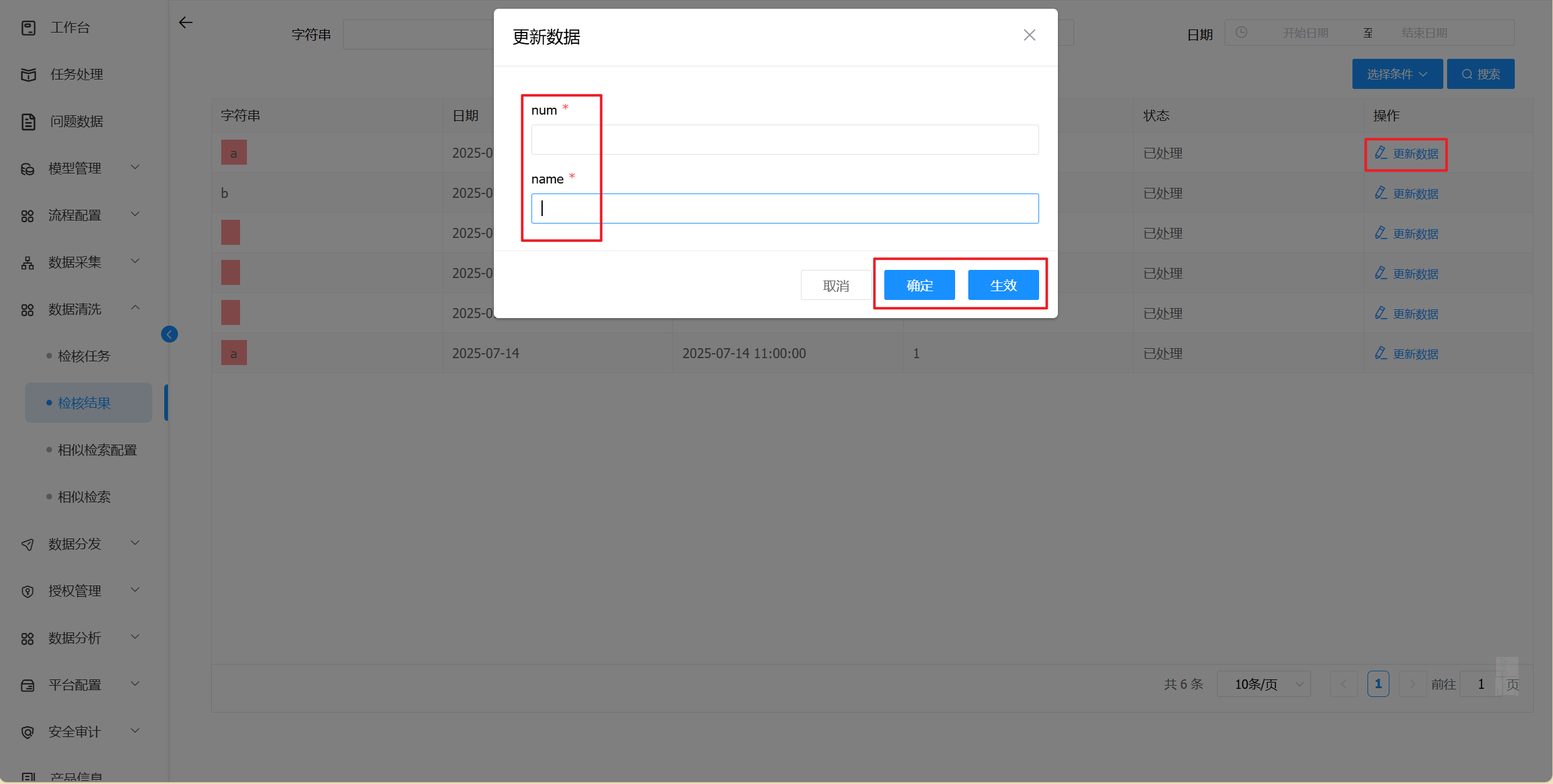 点击更新数据可以更新问题数据中存在问题的字段值,输入新的数据后如果选择【生效】按钮,则该数据更新并生效。如果选择【确定】按钮,则只是更新数据,数据状态为编辑状态。