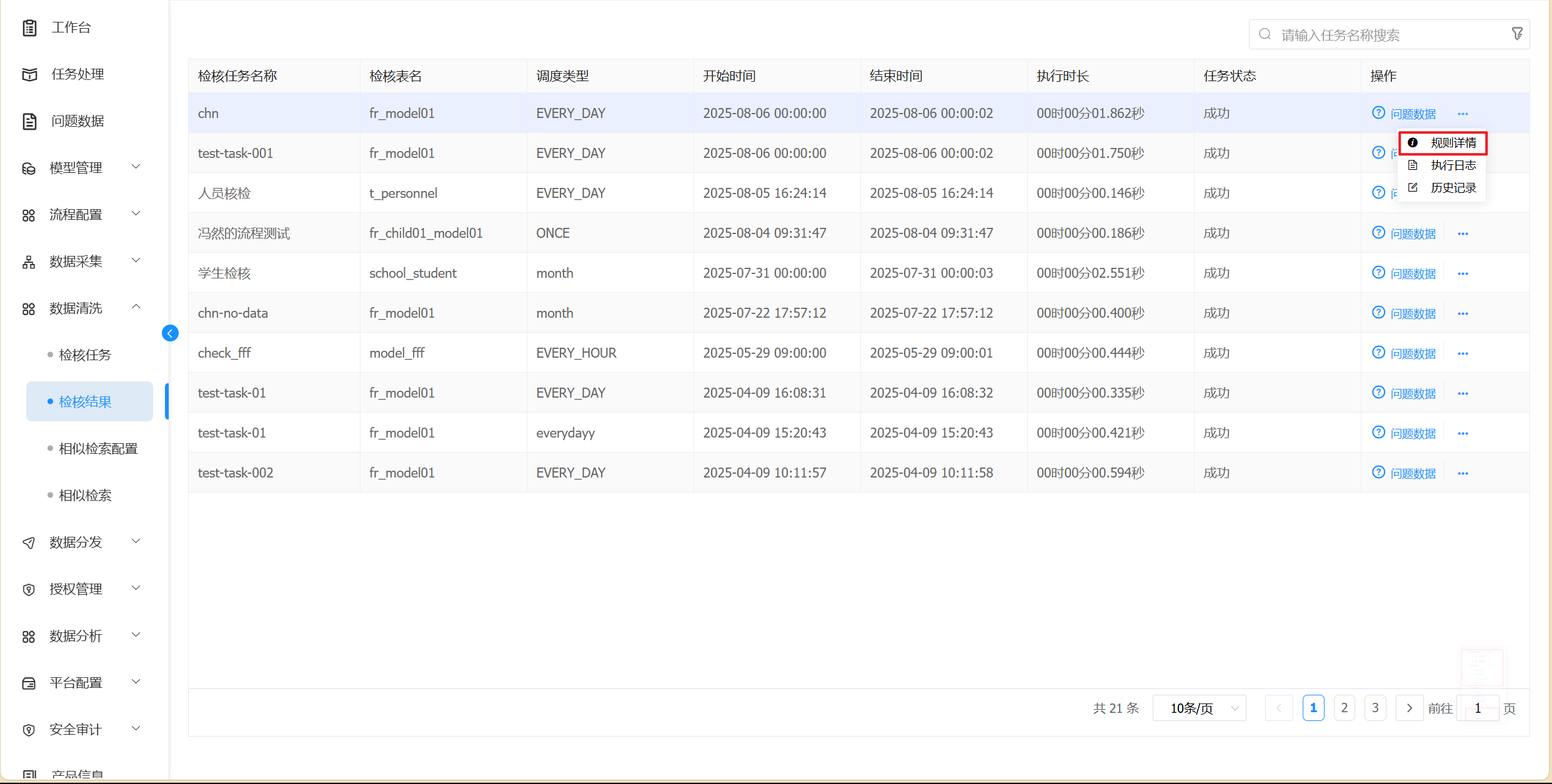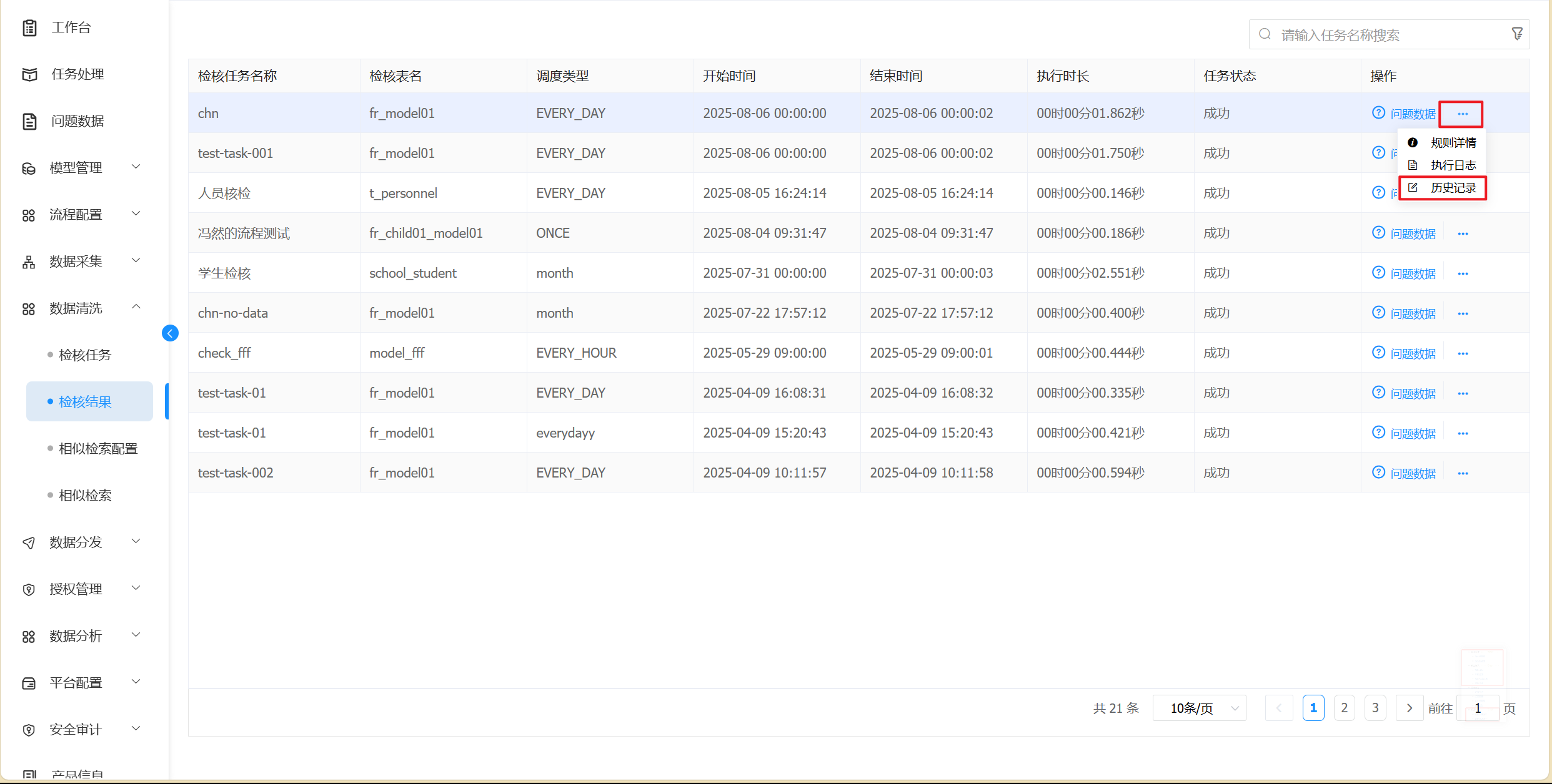 其中也包含问题数据,执行日志,规则详情等页面功能,问题数据功能在历史记录中只支持查看,不支持修改。