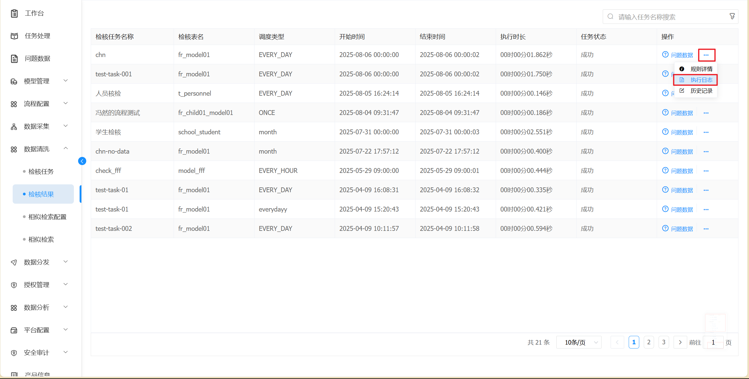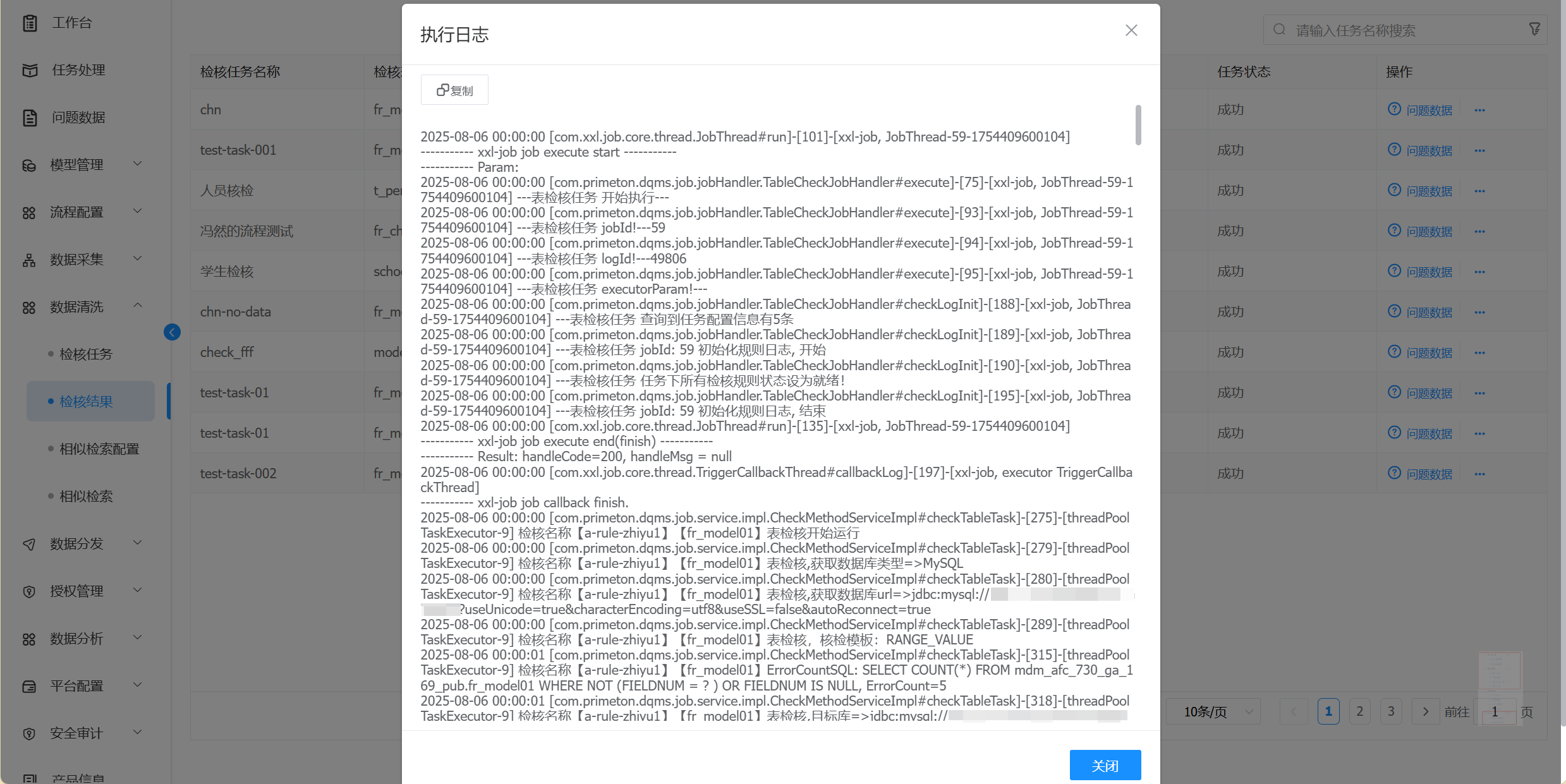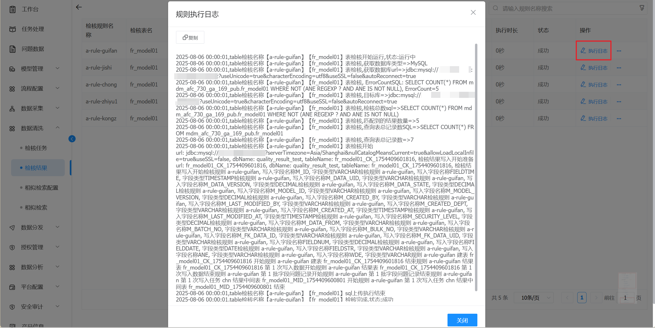 点击检核结果默认页面,检核任务下的【执行日志】按钮,查看检核任务的执行日志
