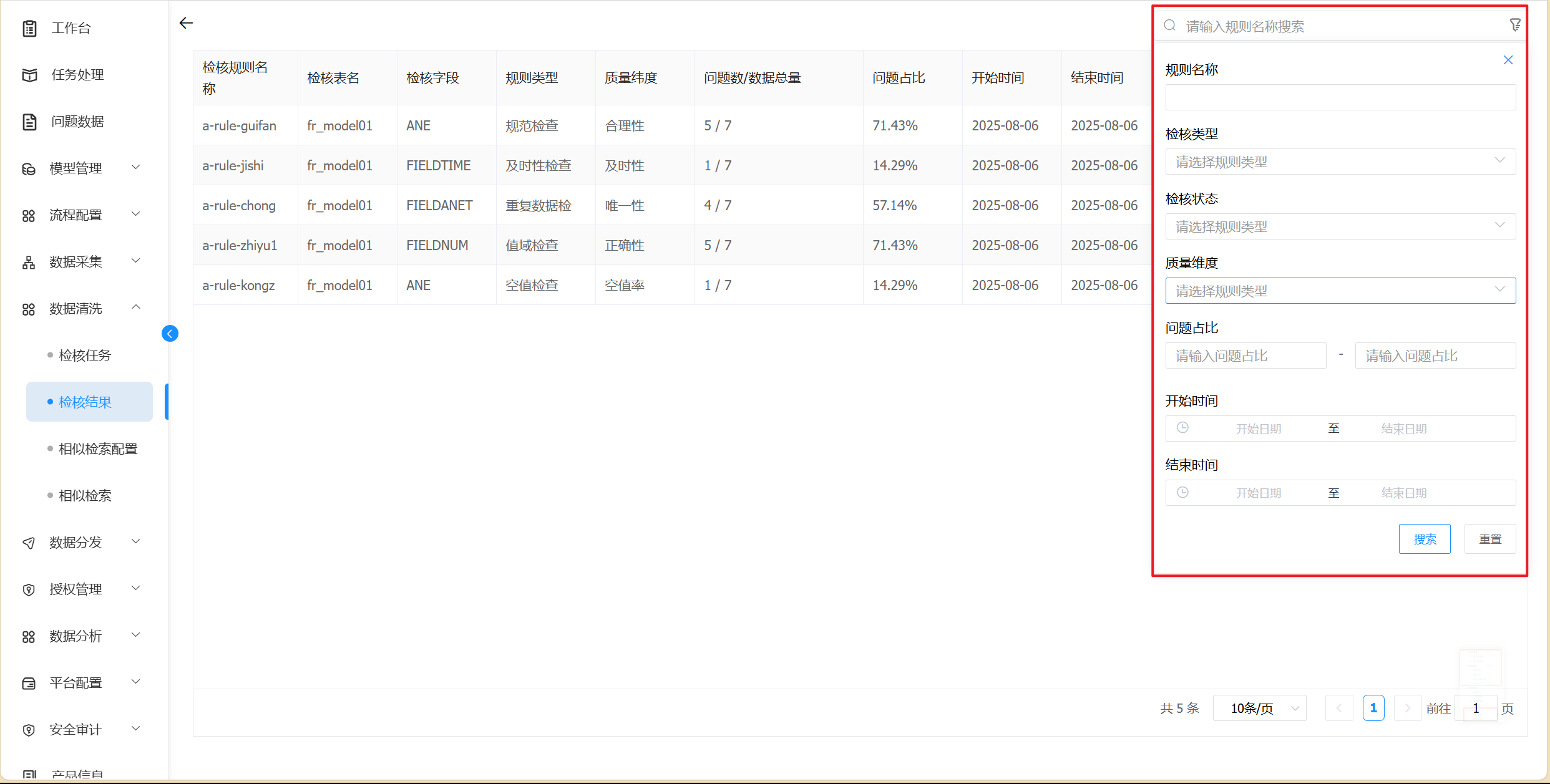 点击右上角搜索按钮,可以根据指定条件搜索检核规则结果