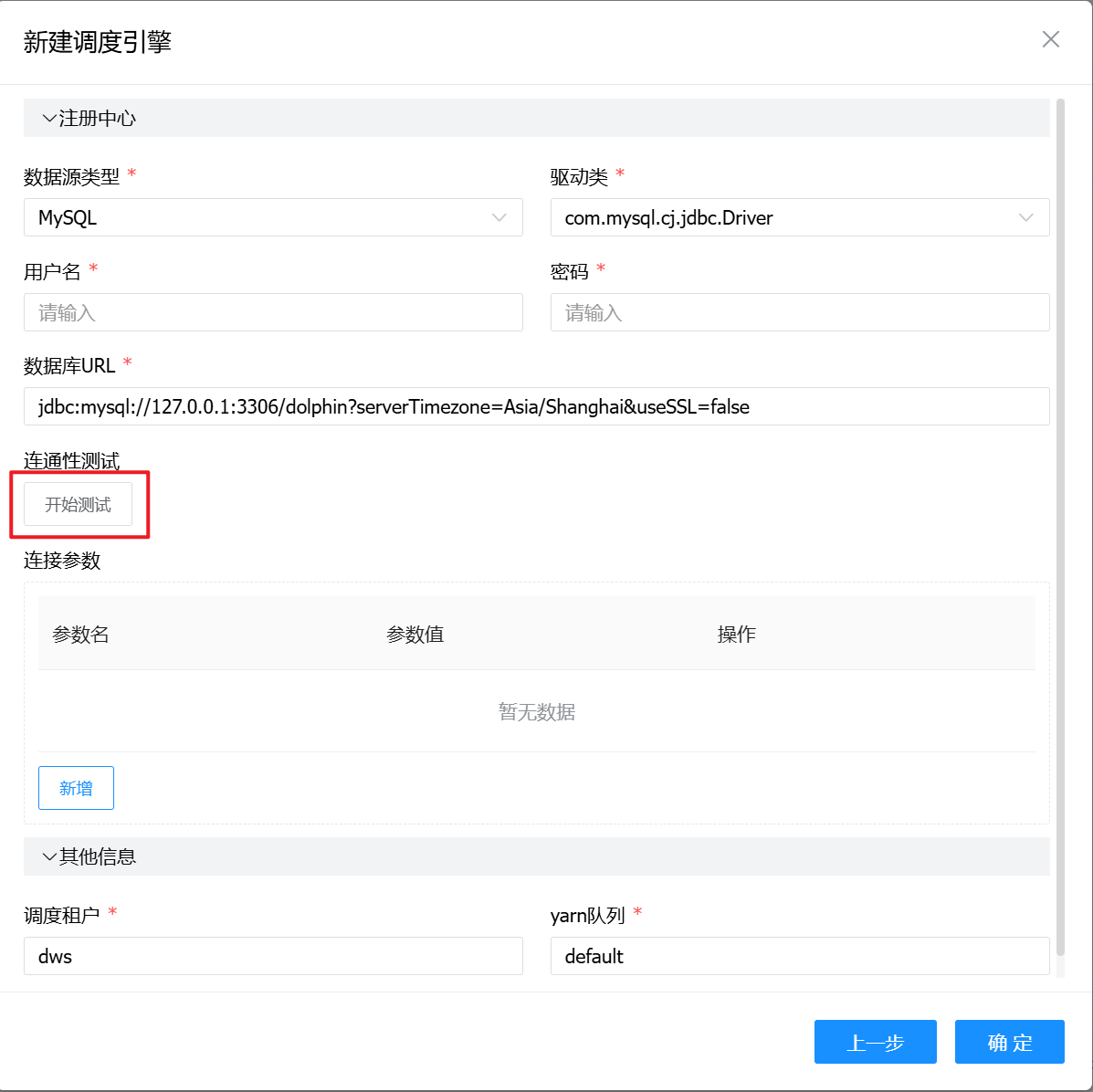 数据库填写调度引擎所在的数据库,填写完毕后点击【开始测试】,进行连通性测试,测试成功后点击【确定】。