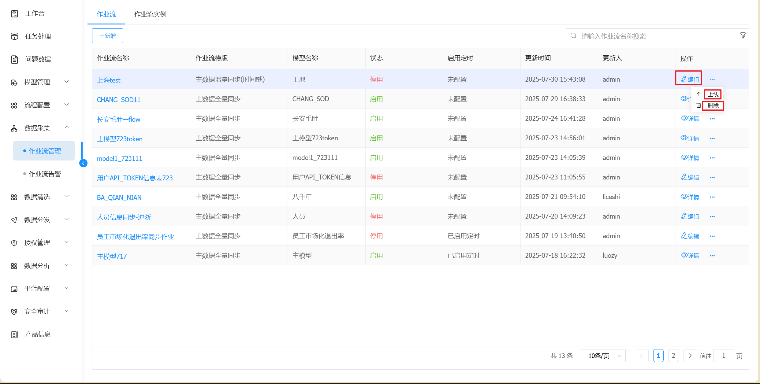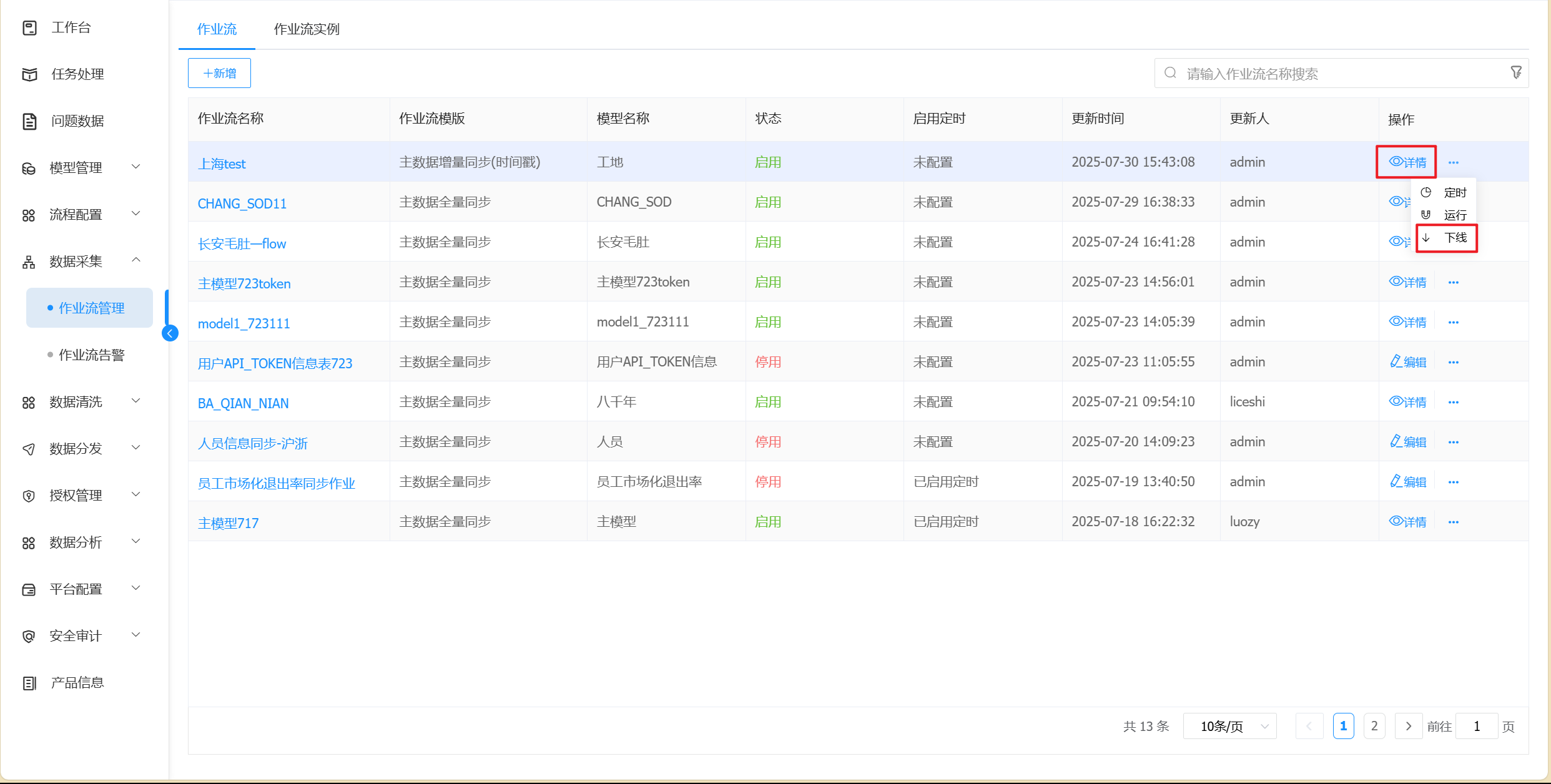 访问路径【主数据管理门户】→ 【数据采集】→【作业流管理】进入作业流页面。