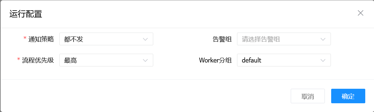 - 流程优先级:流程运行的优先级,分五个等级:最高(HIGHEST),高(HIGH),中(MEDIUM),低(LOW),最低(LOWEST)。当 master 线程数不足时,级别高的流程在执行队列中会优先执行,相同优先级的流程按照先进先出的顺序执行。
