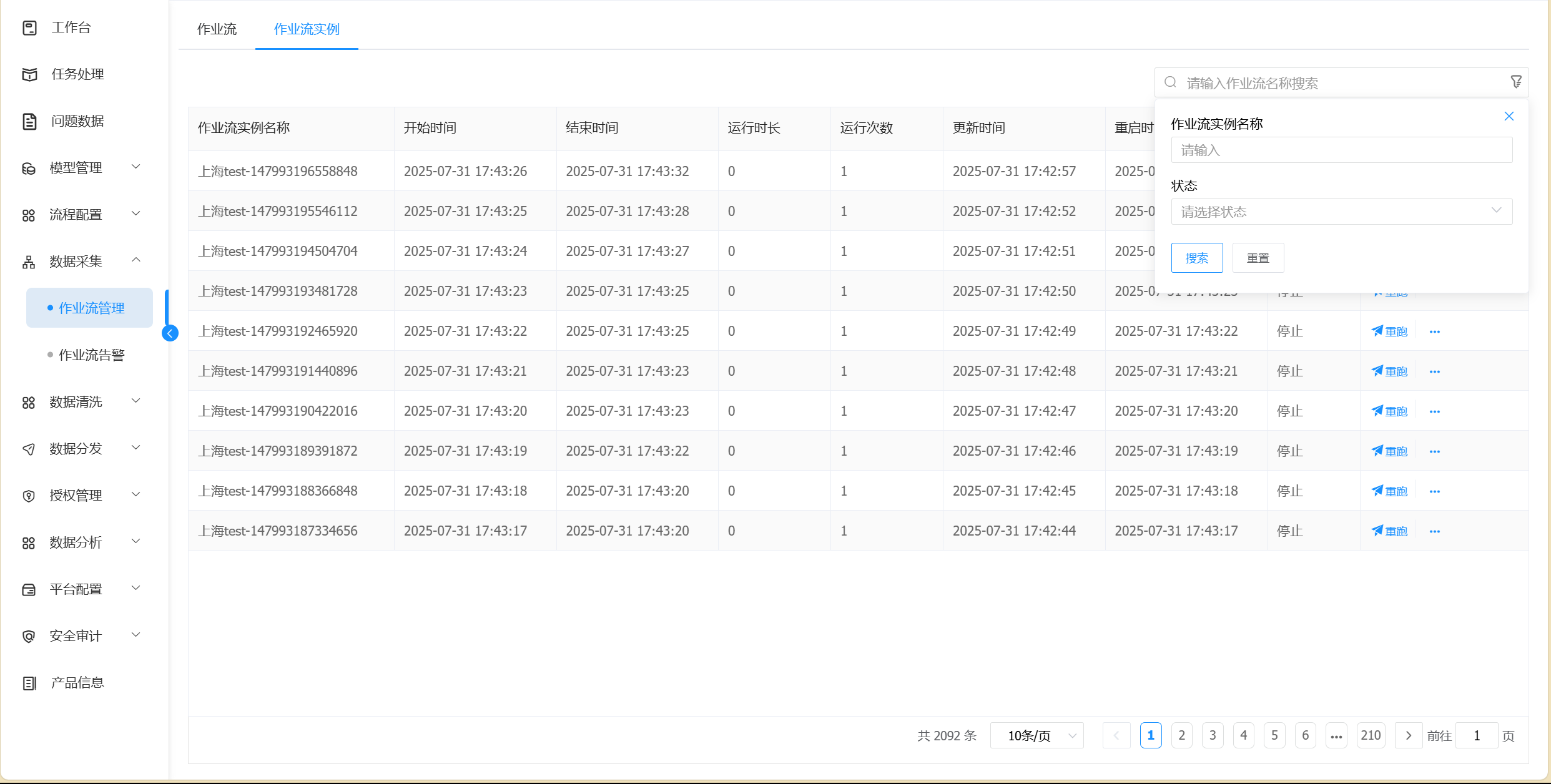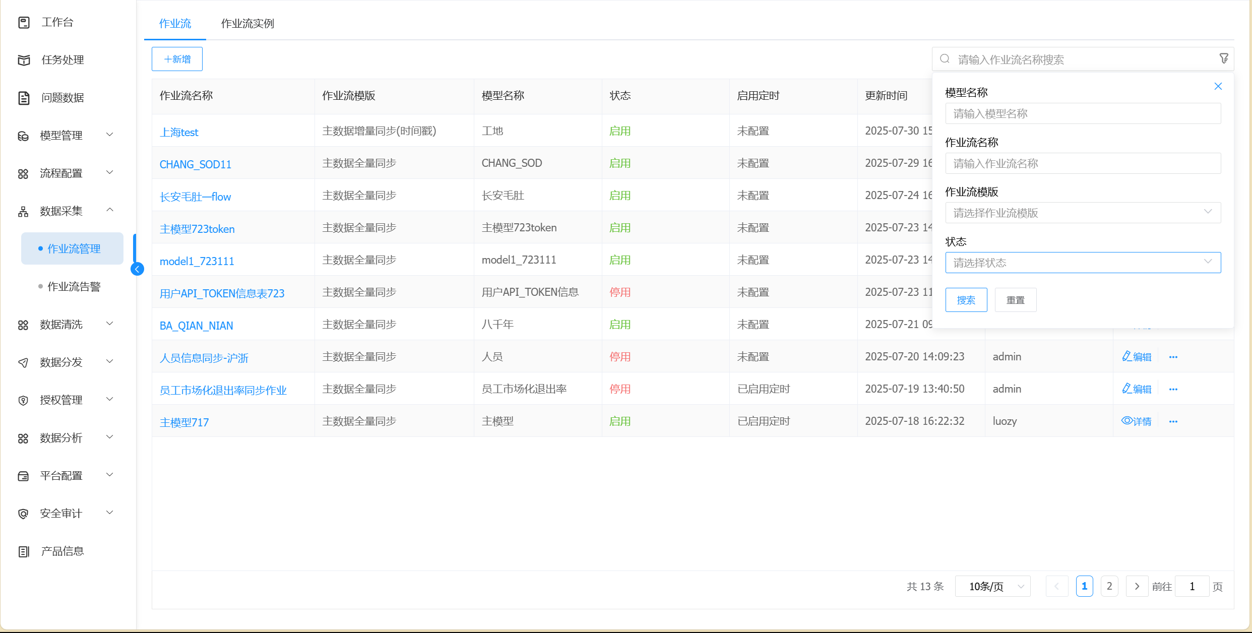 可以根据模型名称、作业流名称、作业流模板、状态,进行条件查询