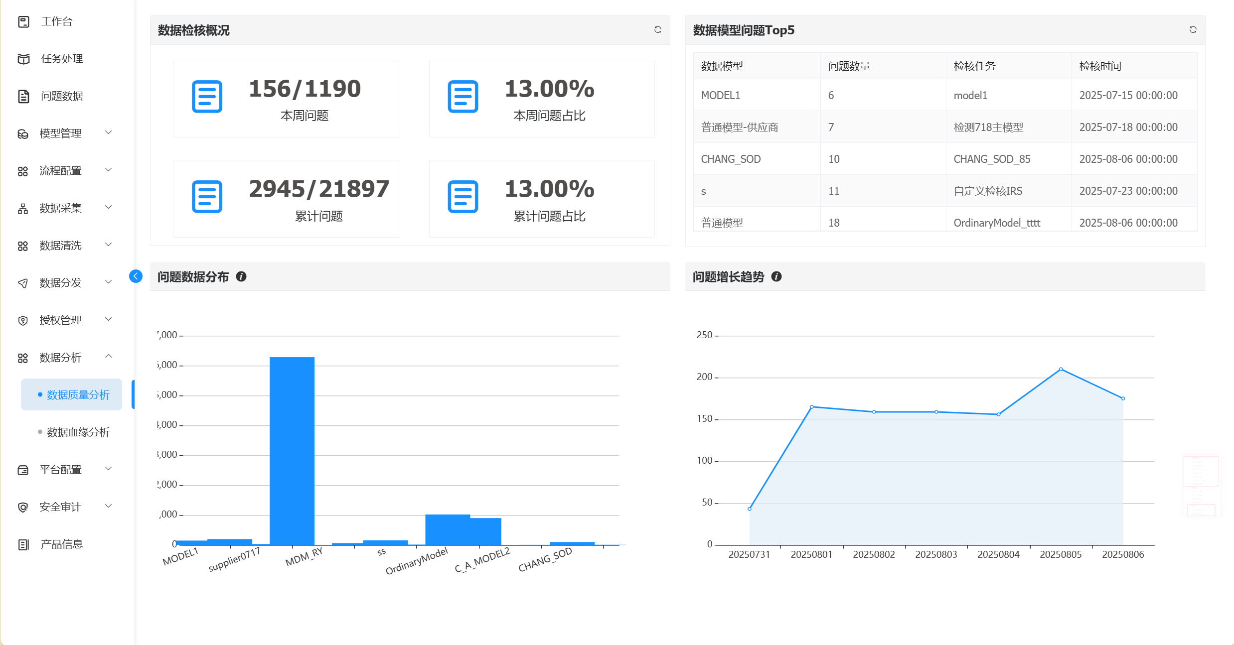 | 累计问题占比 | 所有检核结果中,出现问题的数据量/检核的数据总量的比值。 |