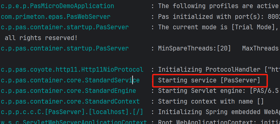 应用启动完成后查看控制台输出信息,若出现**”PAS“**相关字样代表改造成功。